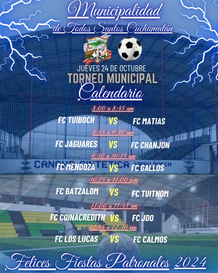 Este jueves 24 de octubre, se llevara a cabo los encuentros deportivos en el #TORNEO_MUNICIPAL, lugar Cancha Sintética Winaq Squech.![]()