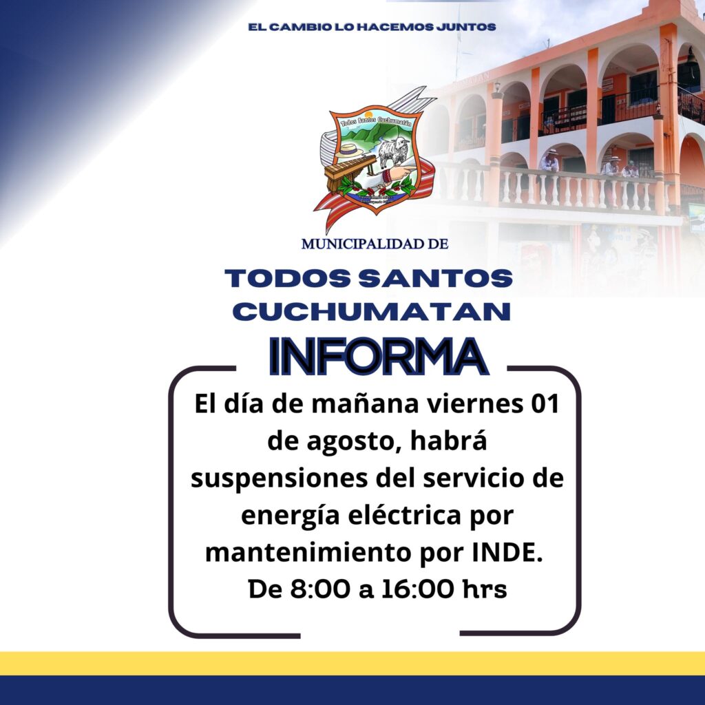 ¡AVISO IMPORTANTE!Aviso a la población de Todos Santos Cuchumatán, le informa que el día de mañana viernes 01 de agosto, habrá suspensión de energía eléctrica, por trabajos programados por INDE.De 8:00 a 16:00 hrs.