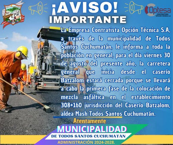 La Empresa Contratista Opción Técnica S.A, a través de la municipalidad de Todos Santos Cuchumatán, le informa a toda la población en general, para el día viernes 30 de agosto del presente año, la carretera general que inicia desde el caserío Batzalom estará cerrada porque se llevará a cabo la primera fase de la colocación de mezcla asfáltica en el establecimiento 308+160 jurisdicción del Caserío Batzalom, aldea Mash Todos Santos Cuchumatán.
