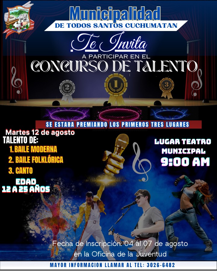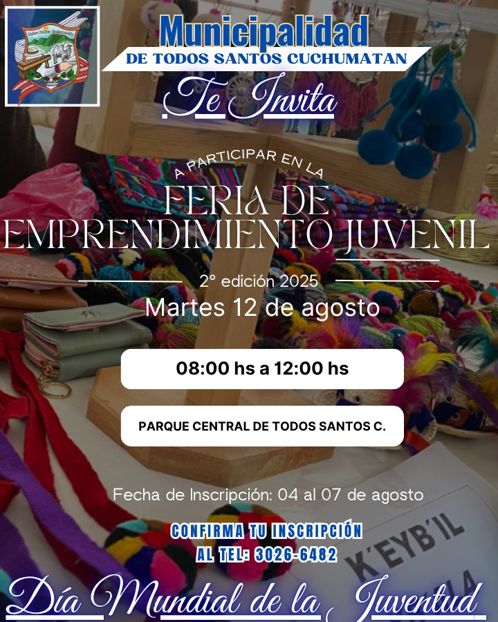 La Municipalidad de Todos Santos Cuchumtán a través de la Oficina Municipal de la Juventud, hace la cordial invitación a usted joven para participar en #La_Feria_de_Emprendimiento y en #El_Concurso_de_Talento, para celebrar juntos #El_Día_de_la_Juventud.