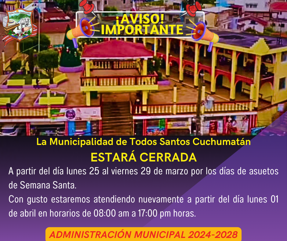 Información importante a toda la población en general de Todos Santos C. Se informa que el día lunes 25 al viernes 29 de marzo del presente año, la Municipalidad De Todos Santos Cuchumatán Administración 2024-2028, estará cerrada por los días de asuetos de semana santa.