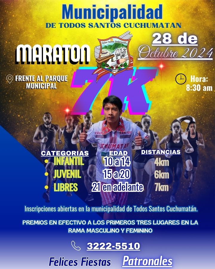 Para celebrar #La_Fiesta_Patronal_del_Municipio_de_Todos_Santos_Cuchumatán, La Municipalidad de Todos Santos Cuchumatán, hace la cordial invitación a todos/as los atletas a participar en el evento de #Maratón_7K por la fiesta patronal del Municipio de Todos Santos Cuchumatan.![]()