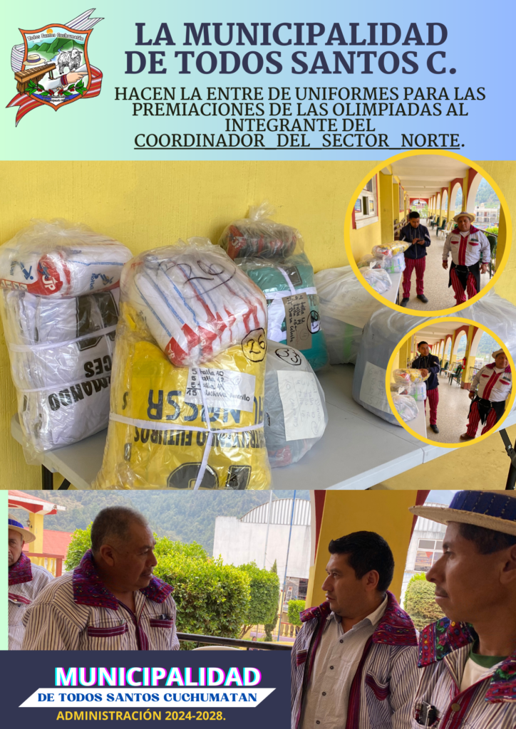 Con el apoyo de la Municipalidad de Todos Santos Cuchumatán Administración 2024-2028, nuestros #Autoridades_Municipales, hacen la entre de uniformes para las premiaciones de las olimpiadas al integrante del #Coordinador_del_Sector_Norte.