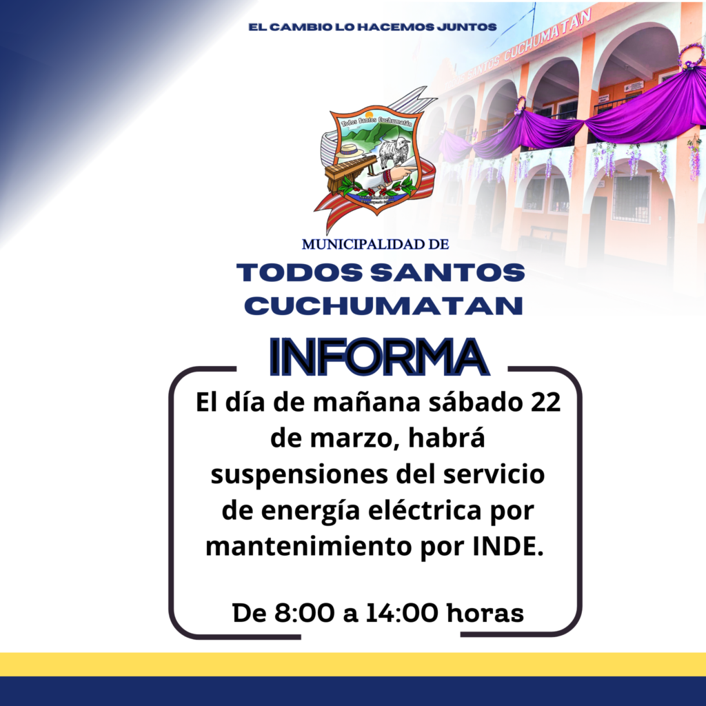 Aviso a la población de Todos Santos Cuchumatán, le informa que mañana sábado 22 de marzo, habrá suspensión de energía eléctrica, por trabajos programados por INDE.